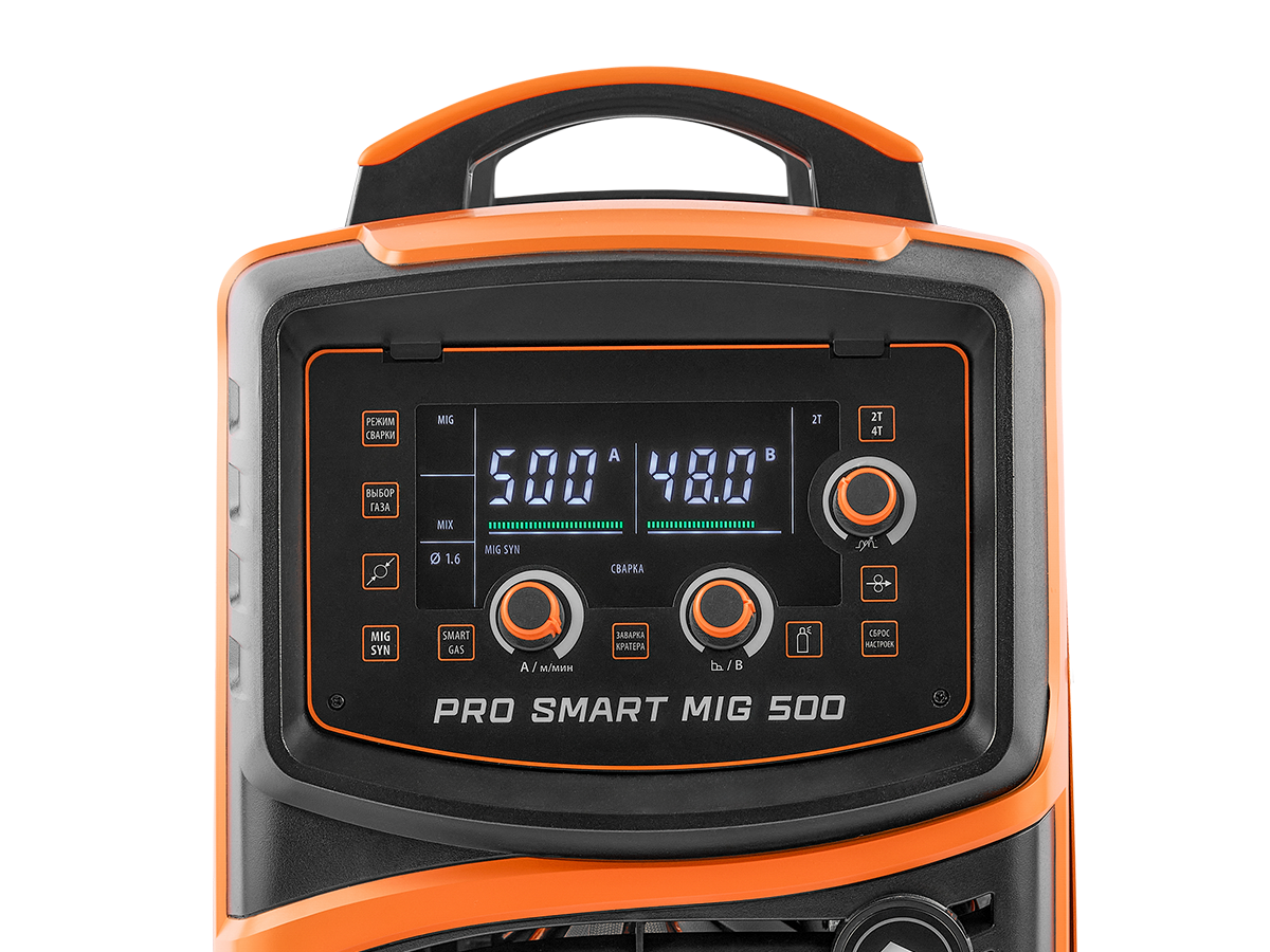 PRO SMART MIG 500 (N215S) — инверторный сварочный аппарат PRO SMART MIG 500 (N215S) предназначен для полуавтоматической сварки в среде защитных газов (MIG/MAG), сварки порошковой проволокой (FCAW), ручной дуговой сварки покрытым электродом (ММА), а также аргонодуговой сварки неплавящимся электродом (TIG DC) при -30 °C.